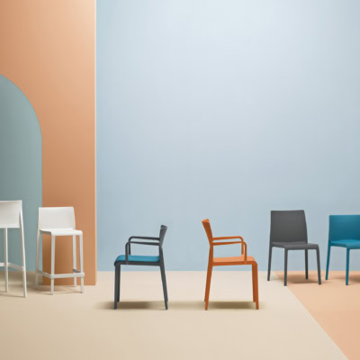 Kolekcja Volt od Pedrali obejmuje również inne modele, w tym krzesła z podłokietnikami i stołki barowe, które razem tworzą spójną i stylową przestrzeń.
